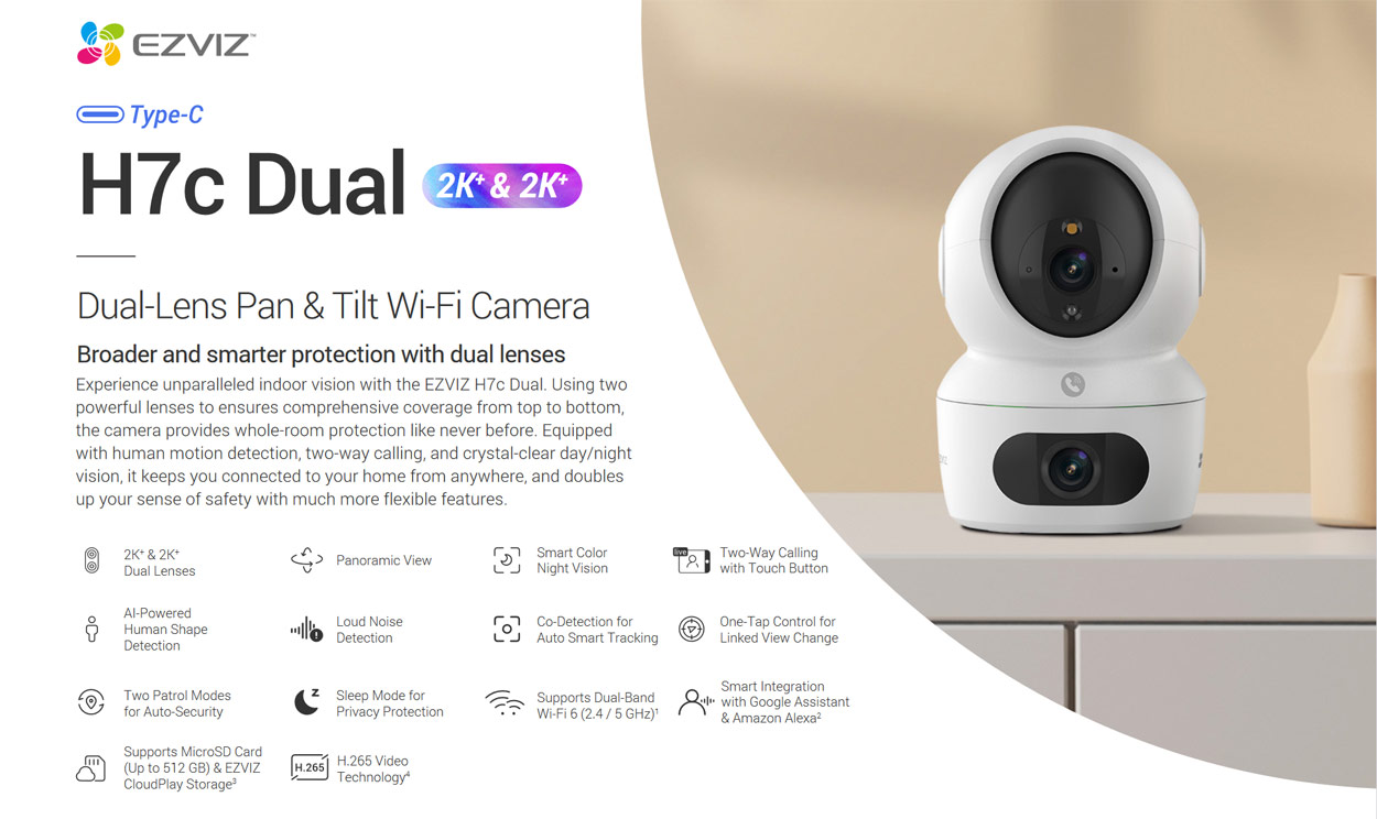 Η ασύρματη και ενσύρματη IP Κάμερα EZVIZ H7c Dual 2K⁺ (CS-H7C-R100-8G44WF) διπλού φακού, περιλαμβάνει στο σώμα της: