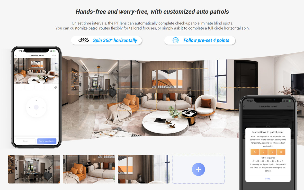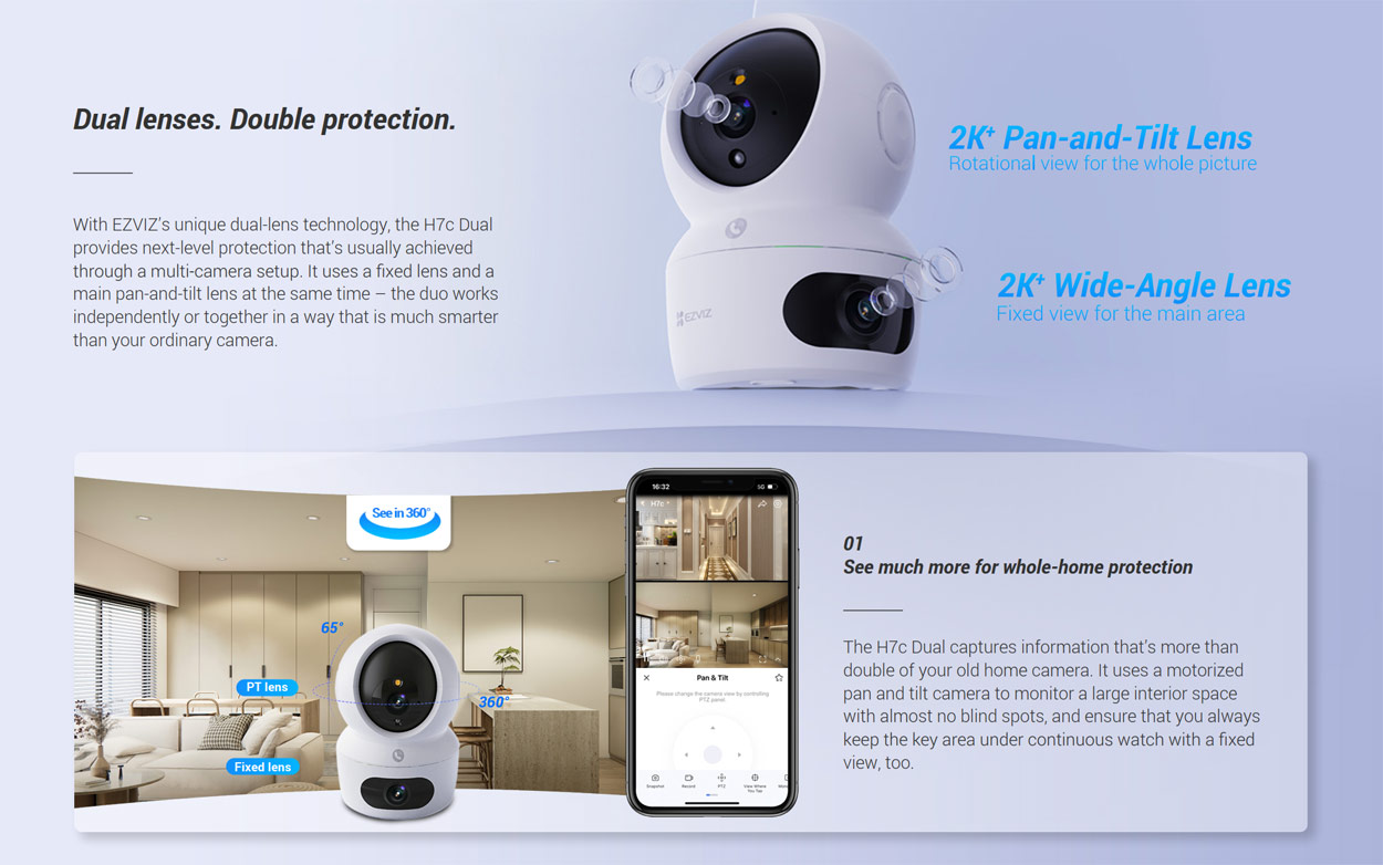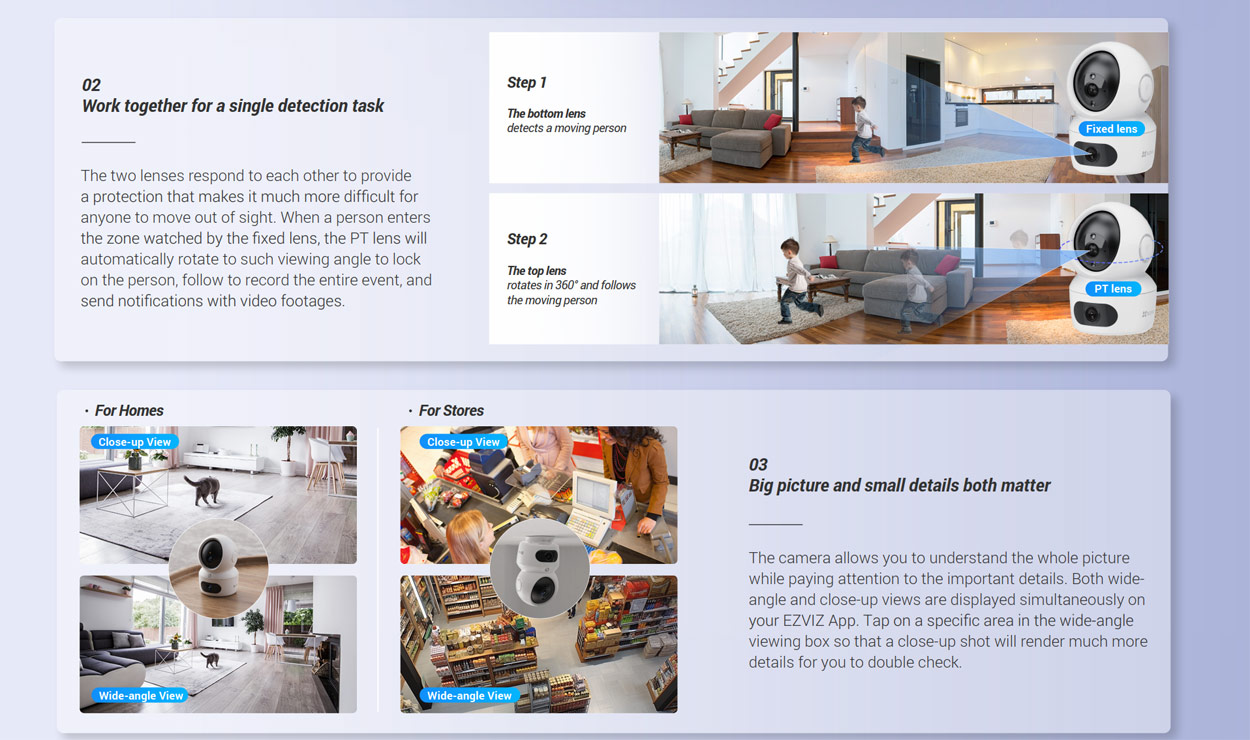 Οι δύο φακοί συνεργάζονται αρμονικά, ώστε να παρέχουν μια προστασία που καθιστά πολύ πιο δύσκολο για οποιονδήποτε να μετακινηθεί εκτός οπτικού πεδίου. Ο σταθερός φακός αναλαμβάνει την επιτήρηση μίας περιοχής και όταν ένα άτομο εισέλθει σε αυτή, τότε ο περιστρεφόμενος φακός θα περιστραφεί αυτόματα σε μια τέτοια γωνία θέασης ώστε να κλειδώσει το άτομο, θα ακολουθήσει την κίνηση του για να καταγράψει ολόκληρο το συμβάν και θα στείλει ειδοποιήσεις με πλάνα βίντεο.