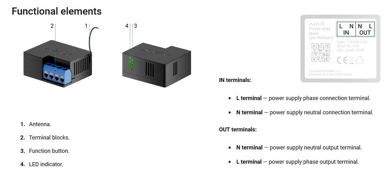 Το WallSwitch είναι ένας ασύρματος διακόπτης 220V AC, που συνδυάζει τη λειτουργία του ρελέ, κατάλληλος για τον χειρισμό ON/OFF συσκευών 220V AC (ενεργοποίηση/απενεργοποίηση). Μέγιστο επιτρεπόμενο ρεύμα φορτίου: 13Α. Μέγιστο φορτίο (230 VAC): 3kW