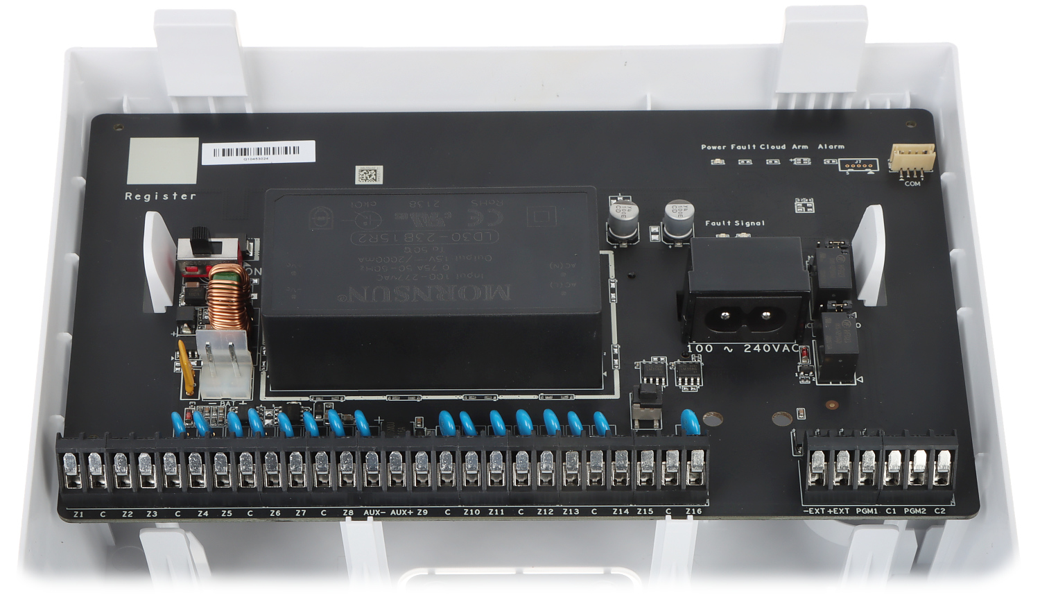 Διαθέτει 16 ενσύρματες ζώνες για σύνδεση καλωδιακών αισθητηρίων με επιλεγόμενες EOL αντιστάσεις και 2 τηλεχειριζόμενες εξόδους ρελέ. Επίσης, διαθέτει εξόδους για την τροφοδοσία αισθητηρίων και σειρήνων 12 VDC ως 1A μέγιστο. Το ενσωματωμένο τροφοδοτικό του δέκτη δέεται τάση 100-240VAC @ 30W. Διαθέτει επαρκή χώρο στο εσωτερικό του για να δεχθεί την επαναφορτιζόμενη μπαταρία μολύβδου 12V 7Ah (δεν περιλαμβάνεται - δείτε σχετικά προιόντα παρακάτω) η οποία μπορεί να προσφέρει μία μέση αυτονομία περίπου ως 36 ώρες, ανάλογα πάντα την ισχύ του συνδεδεμένου φορτίου.