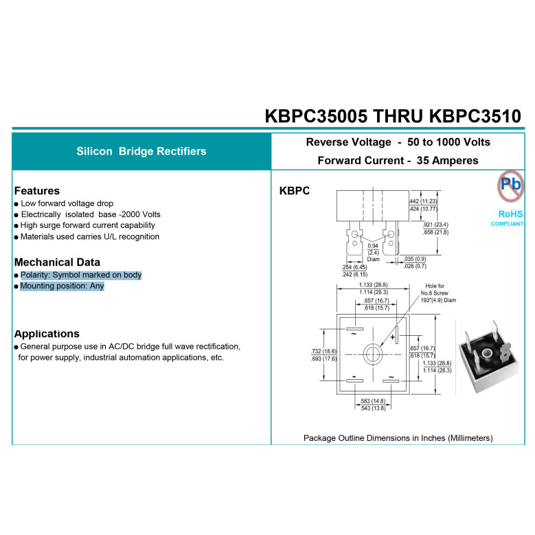 KBPC3510 YNJ Γέφυρα Ανόρθωσης Τετράγωνη Μεταλλική 35A/1000V. Γενικής χρήσης σε ανόρθωση πλήρους κύματος γέφυρας AC/DC, για τροφοδοσία ρεύματος, εφαρμογές βιομηχανικού αυτοματισμού κ.λπ