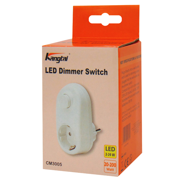 Dimmer Πρίζας με Ροοστάτη για λάμπα LED 24W - αλογόνου & πυρακτώσεως 200W της KANGTAI, CM3005. Ρυθμιστής έντασης ρεύματος (dimmer) για λάμπες LED, αλογόνου, πυρακτώσεως. Ισχύς LED: 3-24W. Ισχύς αλογόνου: 20-200W. Ισχύς πυρακτώσεως: 20-200W.