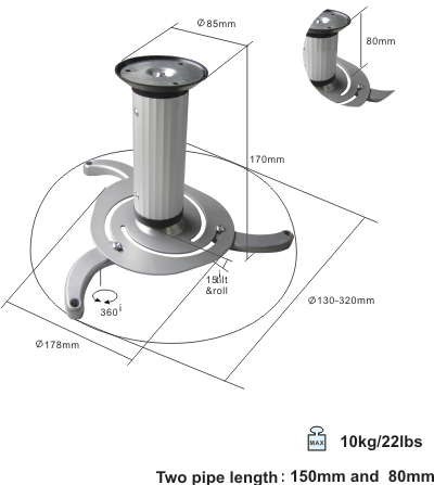Περιλαμβάνει 2 βραχίονες, έναν κοντό 8cm και ένα μακρύ 15cm για να καλύπτει όλες τις ανάγκες. Ρυθμιζόμενη προς όλες τις κατευθύνσεις. Επιτρέπει κλήση ±15 μοιρών. Ο μηχανισμός εγκατάστασης «με μία βίδα» επιτρέπει την εύκολη αφαίρεση του προβολέα από την βάση. Μέγιστο βάρος φορτίου 10Kg. Περιλαμβάνει όλα τα απαραίτητα εξαρτήματα για την συναρμολόγηση.