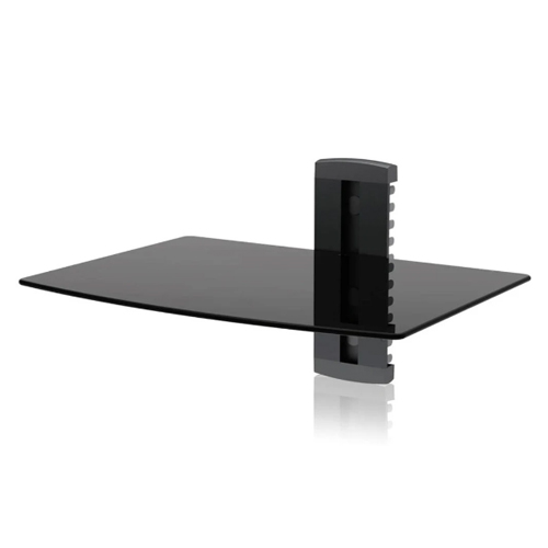 Βάση για Video ή DVD με 1 γυάλινο ράφι. Διαθέτει 1 γυάλινο ράφι tampered glass πάχους 6mm σε μαύρο χρώμα, το οποίο είναι ικανό να αντέξει φορτίο μέγιστου βάρους 10 κιλών. Διαθέτει σύστημα διαχείρισης καλωδίων για να περάσουν τα καλώδια μέσα από τον κορμό της βάσης.