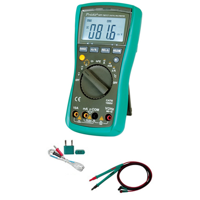 Ψηφιακό Πολύμετρο με Συχνόμετρο Καπασιτόμετρο Θερμοκρασία, Αυτ. Κλίμακας της ProsKit, MT-1217. Διαθέτει μεγάλη φωτειζόμενη (Backlight) οθόνη LCD 3-3/4, μέτρηση τάσης AC/DC, ρεύματος AC/DC, αυτόματη και χειροκίνητη κλίμακα, μέτρηση ωμικής συνέχειας με buzzer, μέτρηση διόδου & transistor, data hold, ένδειξη χαμηλής στάθμης μπαταριών-υπερφόρτωσης και μέτρηση θερμοκρασίας (περιλαμβάνεται θερμοζεύγος στη συσκευασία), Ακόμα ειδικό stand που το κρατάει "όρθιο" και θήκη καουτσούκ η οποία το προστατεύει από πτώσεις και τη σκληρή χρήση.