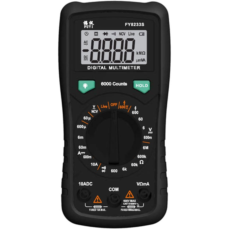 FY8233S Ψηφιακό Πολύμετρο με NCV. Μέτρηση τάσης, έντασης και αντίστασης. Διαθέτει buzzer, αυτόματη απενεργοποίηση και οθόνη με βοηθητικό φωτισμό. Ακόμα ενσωματώνει λειτουργία ανέπαφης ανίχνευσης τάσης (Non Contact AC Voltage Detection) και αυτόματη απενεργοποίηση. Λειτουργεί με 2 x AAA (περιλαμβάνονται). Διαστάσεις: 138mm x 68mm x 30mm. Βάρος: 170g (χωρίς μπαταρία).