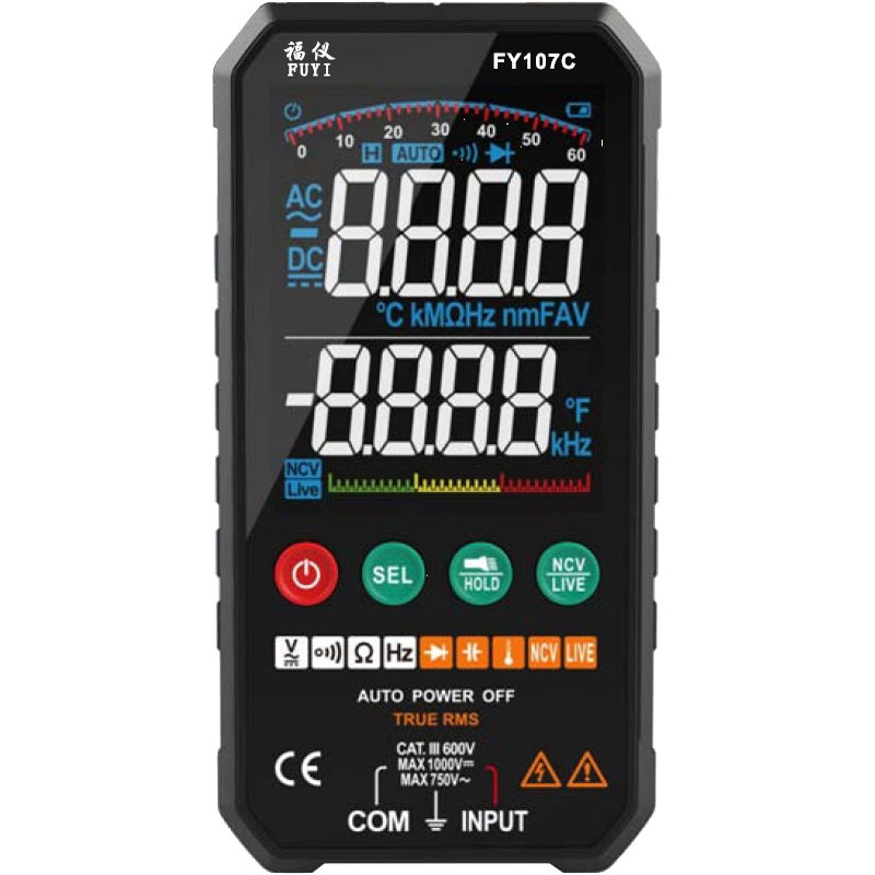 FY107C Ψηφιακό Πολύμετρο με True RMS, NCV και Αυτόματη κλίμακα. Μέτρηση τάσης, χωρητικότητας, συχνότητας, θερμοκρασίας και αντίστασης. Διαθέτει μεγάλη οθόνη ενδείξεων και αυτόματες κλίμακες μέτρησης. Ακόμα ενσωματώνει λειτουργία ανέπαφης ανίχνευσης τάσης (Non Contact AC Voltage Detection) , φακό και λειτουργία Hold. Λειτουργεί με 2 x AAA (περιλαμβάνονται). Διαστάσεις: 142mm x 70mm x 20mm. Βάρος: 146g (με μπαταρίες)