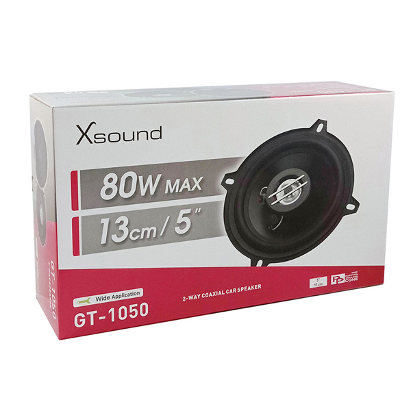 Ζεύγος ομοαξονικών ηχείων 5.25" / 13cm 80 Watt 2 δρόμων της XSOUND, GT-1050. Νέα ολοκληρωμένη σειρά ηχείων αυτοκινήτου από την XSOUND 2 δρόμων. Μέγιστη ισχύς 80 Watt / 20 Watt RMS. Απόκριση συχνότητας: 70Hz-20kHz. Impedance 4 Ohm. Ευαισθησία: 88dB/W/m. Polypropylene cone.