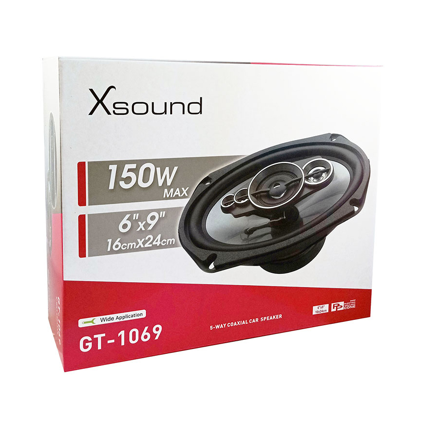 Ζεύγος ομοαξονικών ηχείων Οβάλ 6'' x 9" 150 Watt 5 δρόμων της XSOUND, GT-1069. Νέα ολοκληρωμένη σειρά ηχείων αυτοκινήτου από την XSOUND. Μέγιστη ισχύς 150 Watt / 35 Watt RMS. Απόκριση συχνότητας: 45Hz-22kHz. Impedance 4 Ohm. Ευαισθησία: 92dB/W/m. Polypropylene cone.