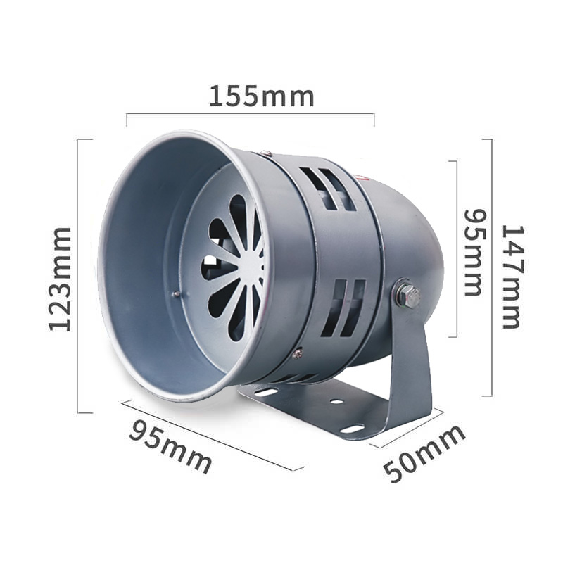 MS-290-12VDC Μεγάλη σειρήνα περιστροφική με μοτέρ. Τροφοδοσία 12V DC. Κατανάλωση 7.5Α σε λειτουργία / 20Α κατά την εκκίνηση. Μεταλλικό σώμα σε γκρί χρώματος. Διαστάσεις: Φ125x158mm.