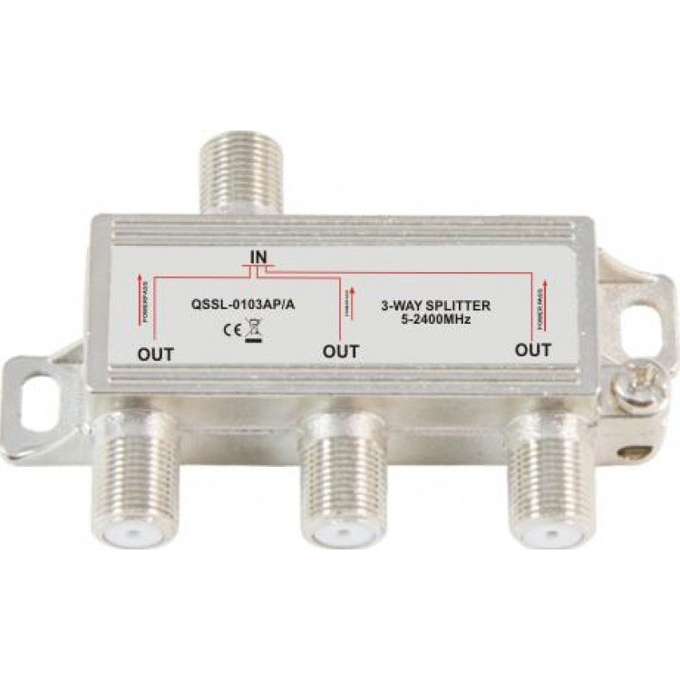 JAGER QSPL3 Επίγειος και δορυφορικός διακλαδωτής 3 εξόδων υψηλής θωράκισης, με φις F. Συχνότητες 5 - 2400MHz. Επιτρέπει τη διέλευση ρεύματος dc σε όλες τις εξόδους.