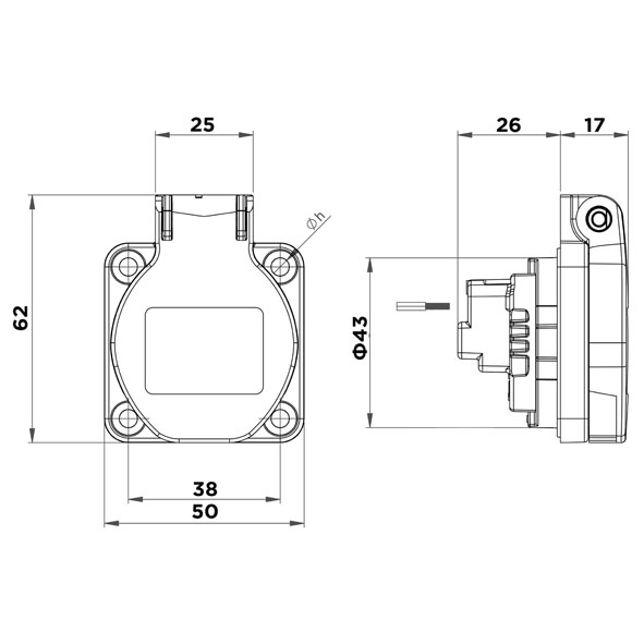 Πρίζα Σούκο χωνευτή 2P 16A IP54, PCE 105-0b. Διαθέτει καπάκι για μεγαλύτερη ασφάλεια με ονομαστική τάση 230V και ονομαστική ένταση 16A.