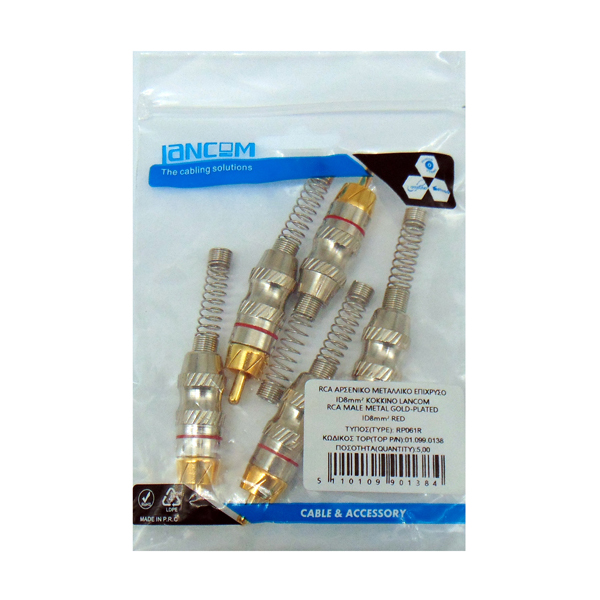 RP061R Επίχρυσο RCA Αρσενικό για καλώδιο διαμέτρου 8mm με κόκκινη ρήγα.