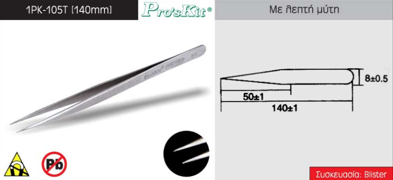 Προσέλα με Λεπτή μύτη 140mm της Proskit, 1PK-105T. Κατασκευασμένη από ανοξείδωτο ατσάλι, με ίσια μύτη, κατάλληλη για εφαρμογές όπως κατασκευή και επισκευή ηλεκτρονικών, ρολογιών, κοσμημάτων, μοντελισμός κ.α.