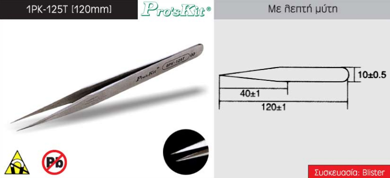 Προσέλα με Λεπτή μύτη 120mm της Proskit, 1PK-125T. Κατασκευασμένη από ανοξείδωτο ατσάλι, με ίσια μύτη, κατάλληλη για εφαρμογές όπως κατασκευή και επισκευή ηλεκτρονικών, ρολογιών, κοσμημάτων, μοντελισμός κ.α.