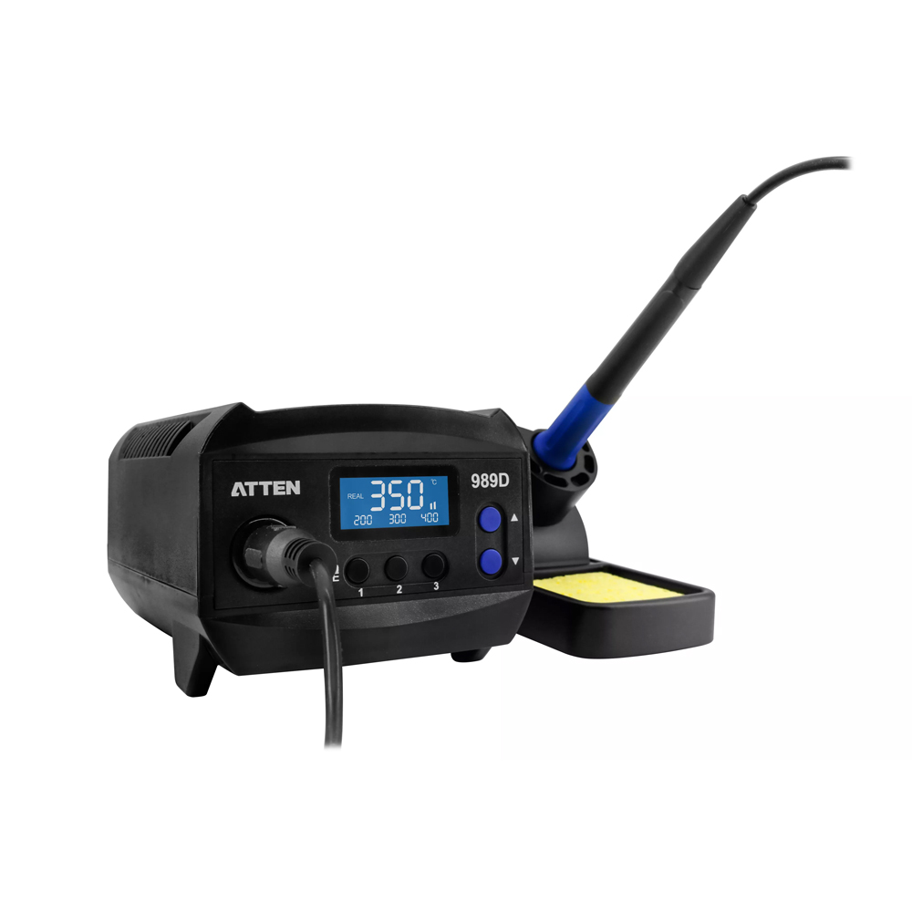 Κεραμικός σταθμός κόλλησης με ρυθμιζόμενη θερμοκρασία και οθόνη LCD της ATTEN AT-989D. Ισχύς σταθμού 65Watt. Εύρος λειτουργίας θερμοκρασίας: +80°C-+480°C. Κατασκευασμένος από αγώγιμα υλικά. ESD safe, προστασία από εκκενώσεις ηλεκτροστατικού ηλεκτρισμού.
