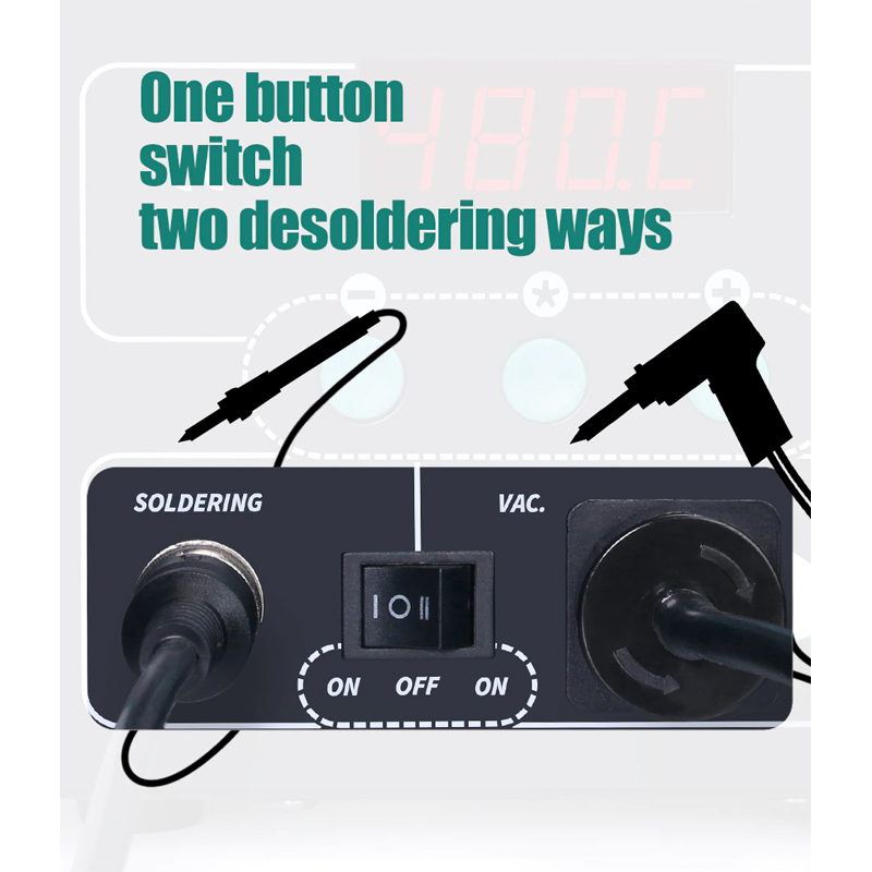 Διαθέτει κολλητήρι αλλά και κολλητήρι αποκόλλησης, προσφέροντας μια ολοκληρωμένη λύση στον τεχνικό. Φέρει εξελιγμένο αισθητήρα θερμοκρασίας και θερμοστάτη για τη γρήγορη επίτευξη και διατήρηση της σωστής θερμοκρασίας. Η θερμοκρασία ρυθμίζεται μέσω πλήκτρων και εμφανίζεται στην LED οθόνη.