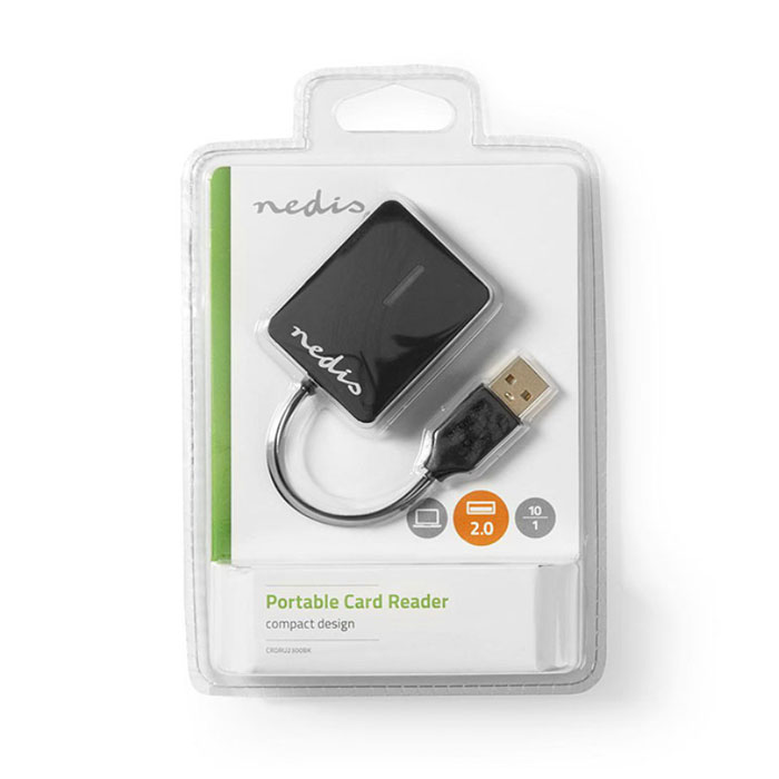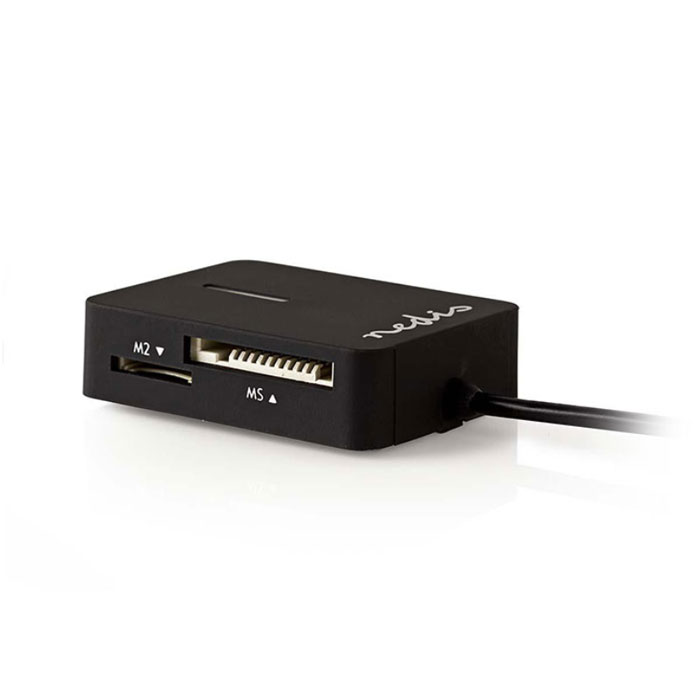 Card reader All-in-One USB 2.0 με ενσωματωμένο καλώδιο της NEDIS, CRDRU2300BK. Yποστηρίζει 5 διαφορετικούς τύπους καρτών μνήμης για μεταφορά και αποθήκευση των αρχείων σας, όπως φωτογραφίες, βίντεο, κ.α..