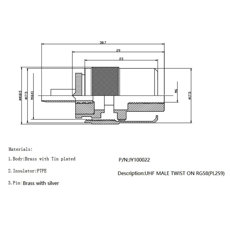 JY10022 JYC Connector UHF Αρσενικό TWIST-ON RG58 (PL259) TEFLON
