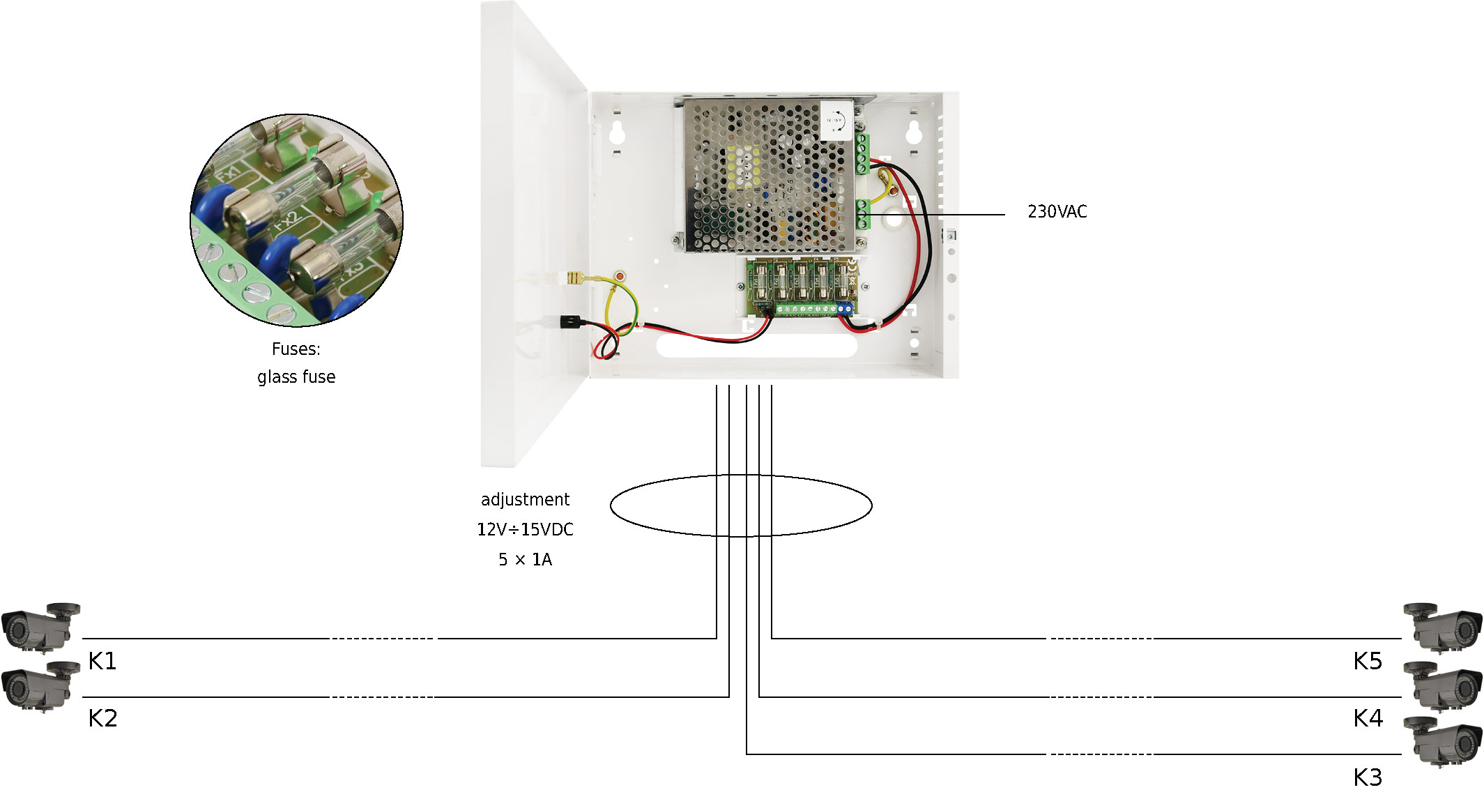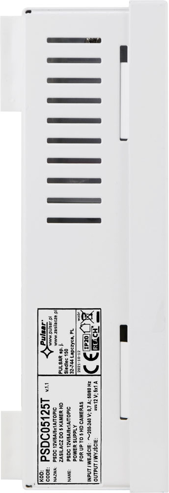 PULSAR PSDC05125T Τροφοδοτικό CCTV 5 ανεξάρτητων εξόδων, κατάλληλο για την τροφοδοσία μέχρι 5 καμερών παρακολούθησης. Τάση Εξόδου 12VDC, ρυθμιζόμενη κεντρικά και για τις 5 εξόδους με εύρος 12V÷15V DC. Η κάθε έξοδος προστατεύεται από γυάλινη ασφάλεια 1A. Συνολική Ρεύμα Εξόδου: 5Α. Μέγιστο ρεύμα ανά έξοδο: 1A. Συνολική Ισχύς 60W max.