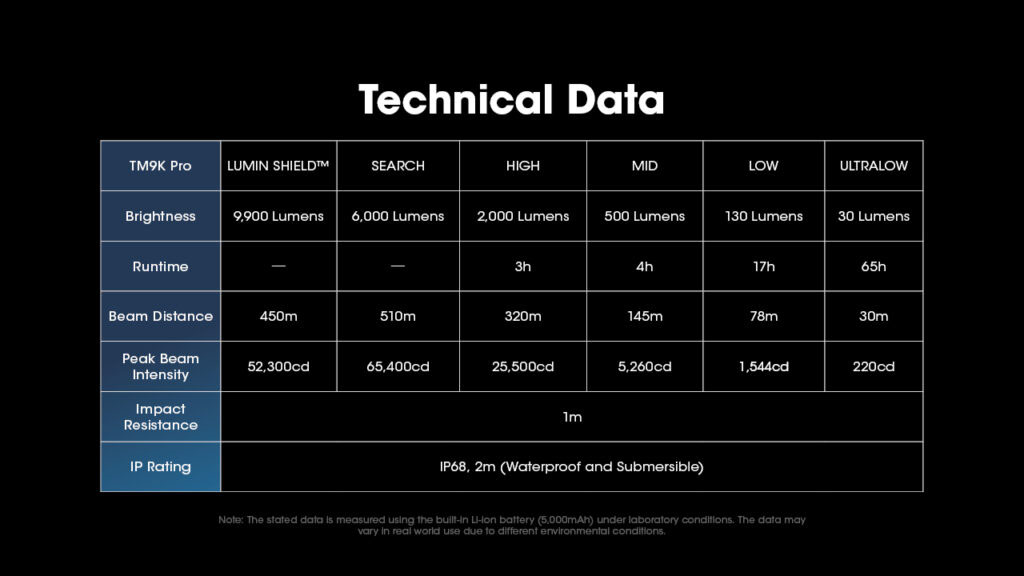 Ο TM9K διαθέτει 4 επίπεδα φωτεινότητας για εναλλαγή επίσης διαθέτει  SEARCH και LUMIN SHIELD