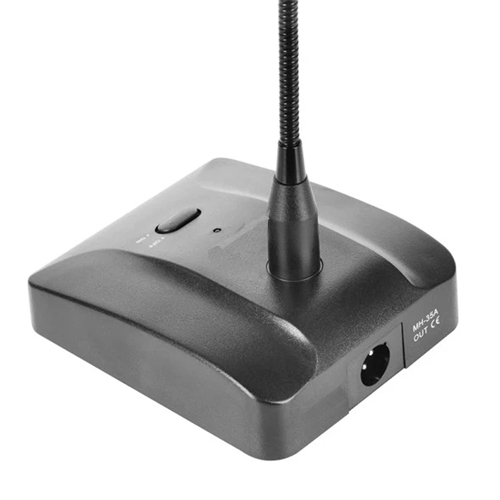 Gooseneck Πυκνωτικό Συνεδριακό μικρόφωνο αναγγελίας με βάση, της AZUSA MH-35A. Η ενεργοποίηση / απενεργοποίηση του μικροφώνου γίνεται με διακόπτη - μπουτόν ομιλίας, η οποία κάνει τους χρήστες πιο ασφαλείς στη χρήση έχοντας οι ίδιοι τον έλεγχο ενεργοποίησης / απενεργοποίησης του μικροφώνου.