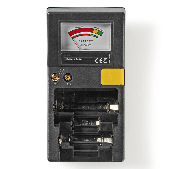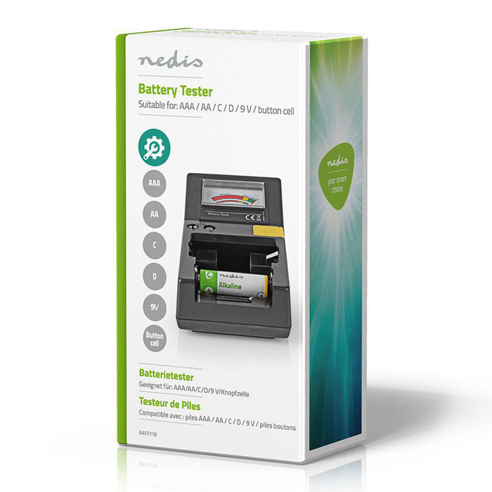 Tester μπαταριών τύπου AAA, AA, C, D, 9V και Button Cell της NEDIS, BATE110. Ελέγξτε τώρα τις μπαταρίες που θέλετε να δοκιμάσετε ή τις ξεχασμένες μπαταρίες που δεν γνωρίζετε την κατάσταση τους με αυτόν τον πρακτικό μετρητή αφού καλύπτει πολλούς τύπους μπαταριών όπως AAA, AA, C, D, 9V, ανάμεσα τους και οι μπαταρίες-κουμπιά. Δεν απαιτεί τροφοδοσία.