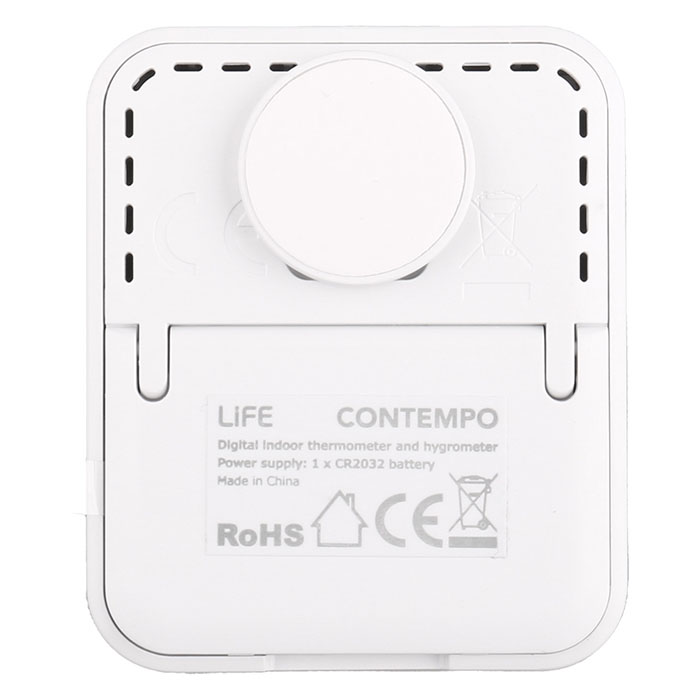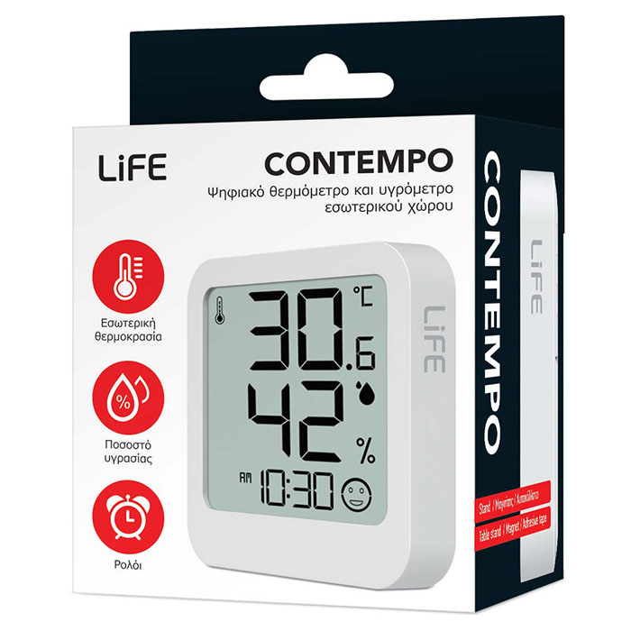 Ψηφιακό θερμόμετρο και υγρόμετρο εσωτερικού χώρου της LIFE, CONTEMPO. Κομψό, μικρό, minimal και σε λευκό χρώμα, είναι ένα τέλειο gadget για κάθε δωμάτιο του σπιτιού σας.