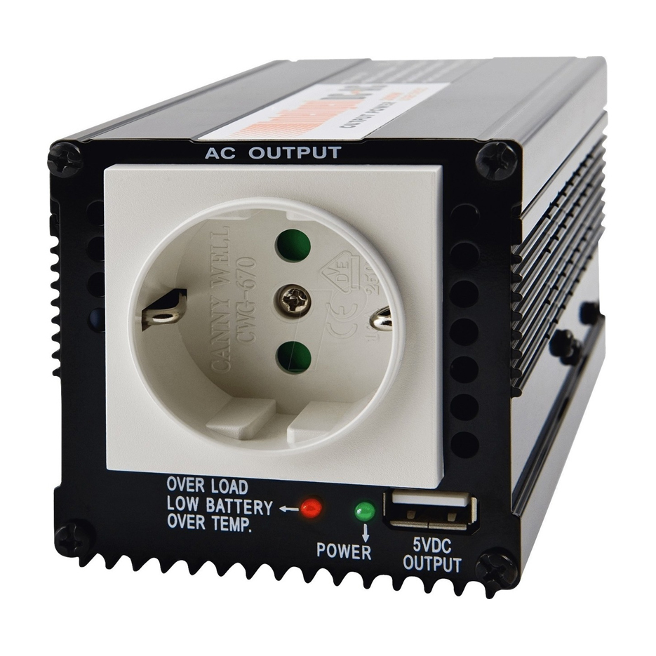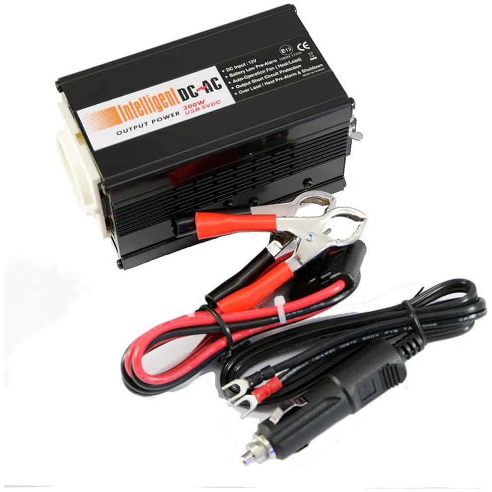 Μεταλλάκτης (inverter) 12V DC - 230V AC, 300 Watt με έξοδο USB 5V DC Output (500mA Max). Προστασία υπερφόρτωσης, προστασία από χαμηλή τάση εισόδου, προστασία από υπέρταση και υπερθέρμανση, φωτεινή και ηχητική ένδειξη χαμηλής τάσης εισόδου (low bat).