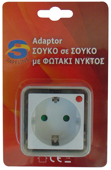 Adaptor Σούκο σε Σούκο και Φωτάκι νυκτός με 4 LED και αισθητήρα Ημέρας/Νύχτας της SAFELINE, SL34101F. Αυτόματη ενεργοποίηση μέσω αισθητήρα μέρας - νύχτας. Αυτοκατανάλωση: <0.8W. Ενεργοποίηση LED σε συνθήκες: <10Lux. Μέγιστο φορτίο πρίζας: 16Α / 230VAC. Μέγιστη ισχύς: 3680W.
