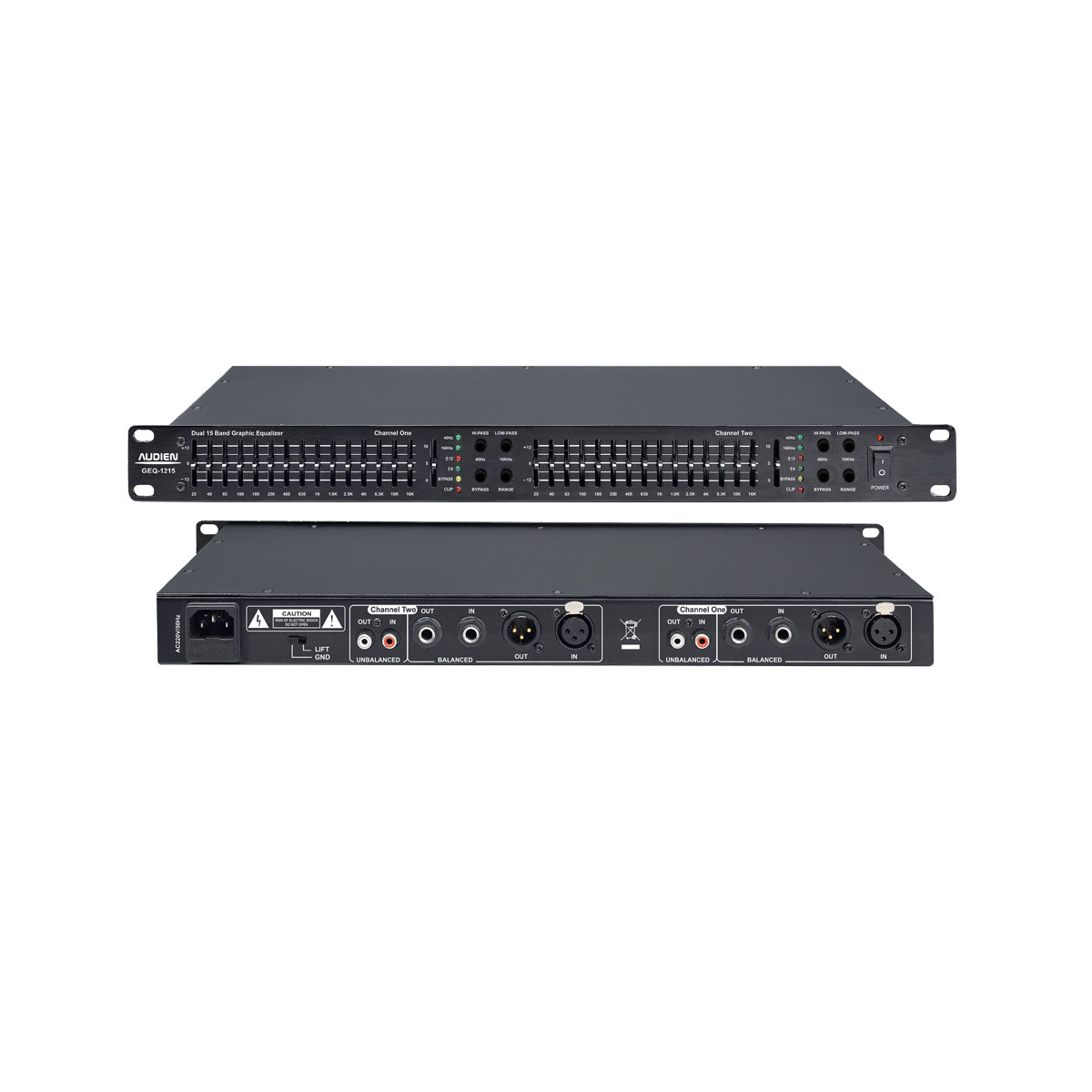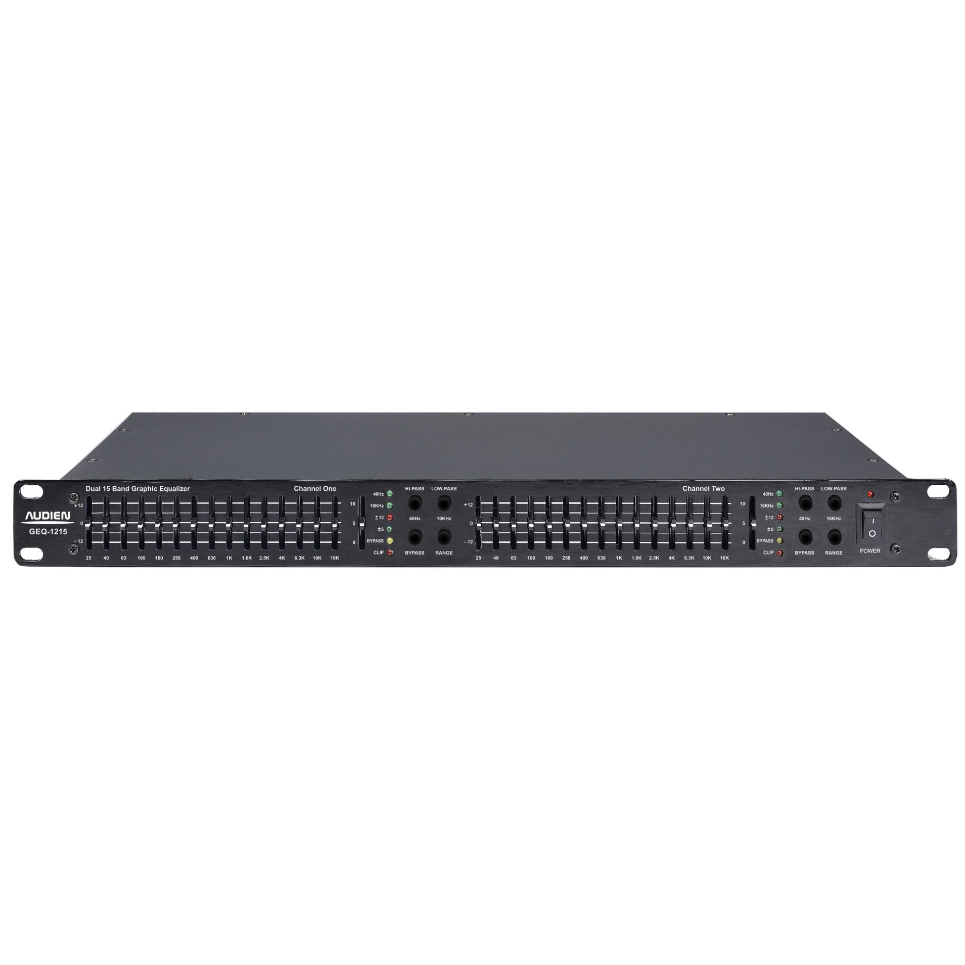 Equalizer 2x15 περιοχών της AUDIEN GEQ-1215. Διαθέτει διακόπτη bypass και ρυθμιστικό gain control. Φίλτρο αποκοπής χαμηλών συχνοτήτων στα 40Hz με εξασθένηση 12dB ανά οκτάβα.