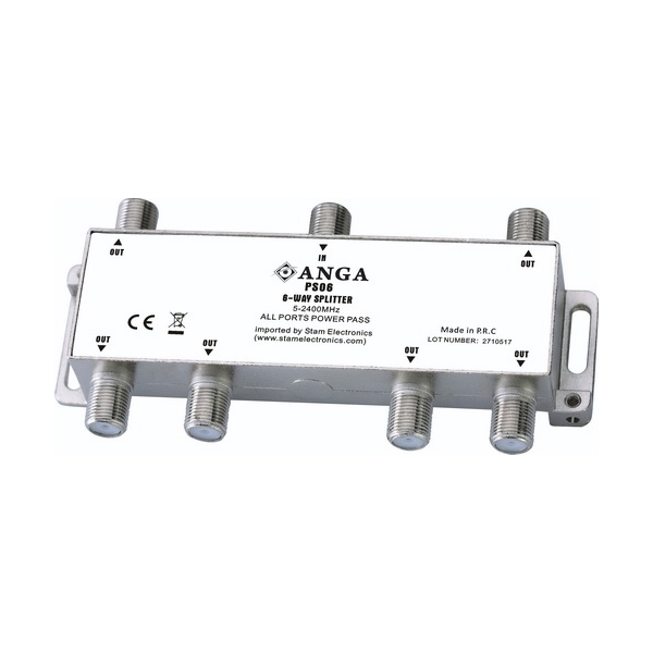 Επίγειος και δορυφορικός διακλαδωτής 6 εξόδων υψηλής θωράκισης, με φις F. Επιτρέπει τη διέλευση ρεύματος dc σε όλες τις εξόδους.