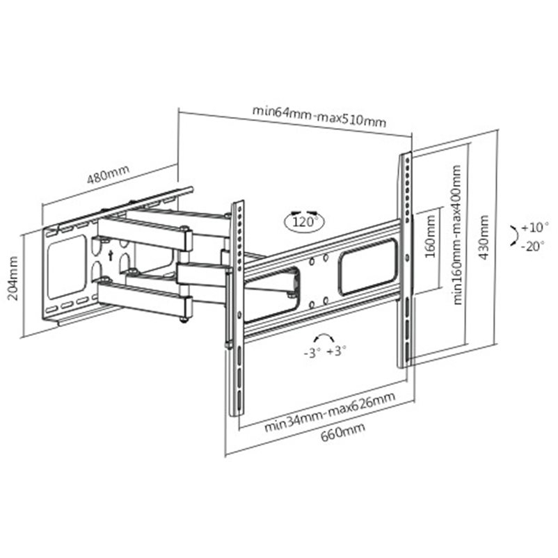 Υποστηρίζει μέγιστο VESA 600x400mm. Έχει δυνατότηταπεριστροφής στον οριζόντιο 60ºάξονα καθώς και δυνατότητα κλίσης έως 20º προς τα κάτω.
