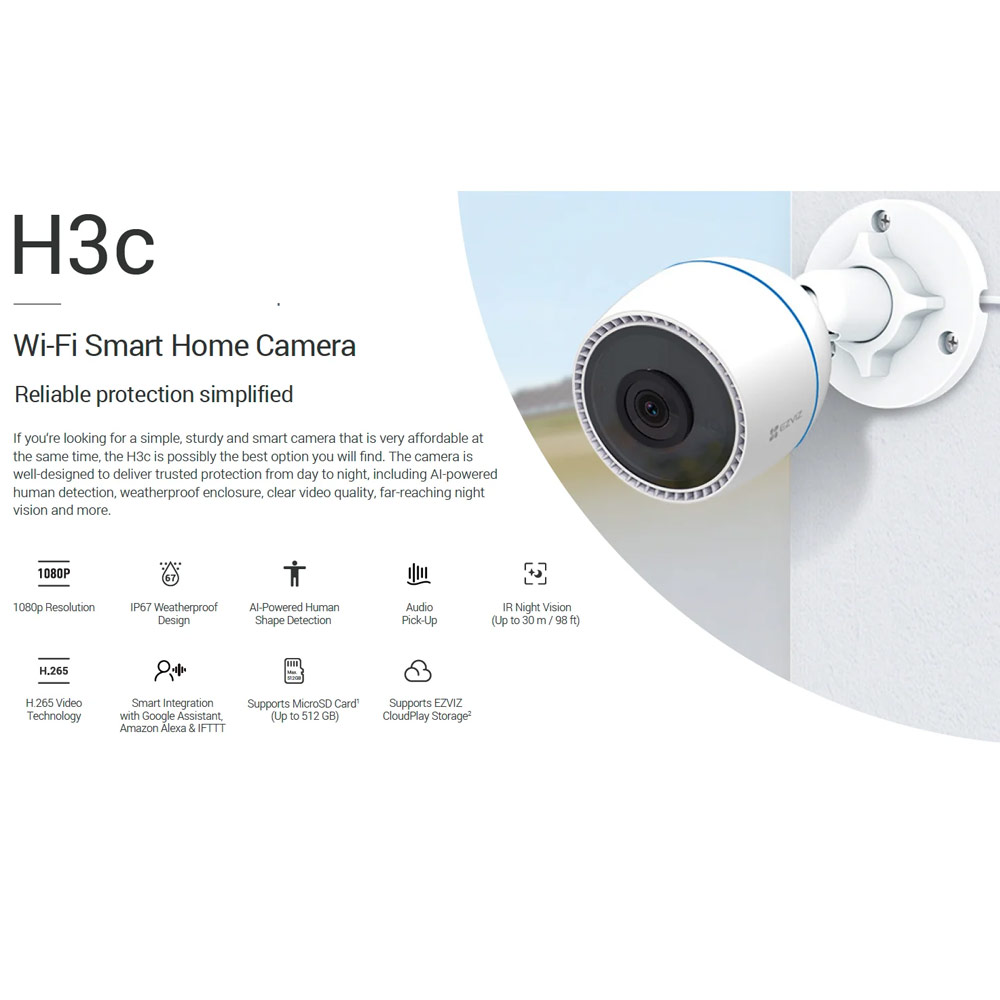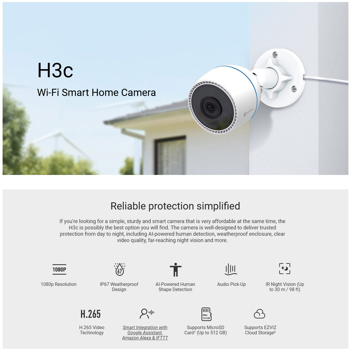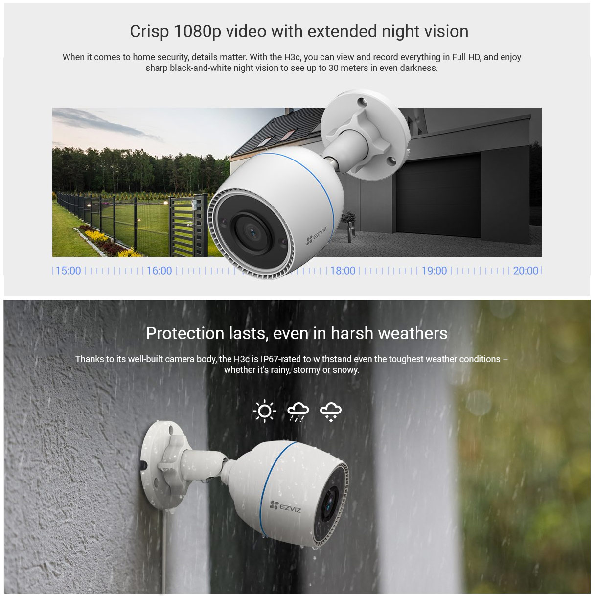 EZVIZ H3C (CS-H3C-R100-1K2WF) - Ασύρματη-ενσύρματη δικτυακή κάμερα Bullet ανάλυσης 2MPixels, αδιάβροχη, με βαθμό στεγανότητας IP67 ώστε να είναι κατάλληλη για εξωτερικούς χώρους. Διαθέτει αισθητήρα 1/2.7’’ και σταθερό φακό 4mm με γωνία οριζόντιας θέασης 82°. Διαθέτει ενσωματωμένο Wi-Fi 2.4 GHz για ασύρματη σύνδεση στο δίκτυο αλλά υποστηρίζει και ενσύρματη σύνδεση μέσω Ethernet.