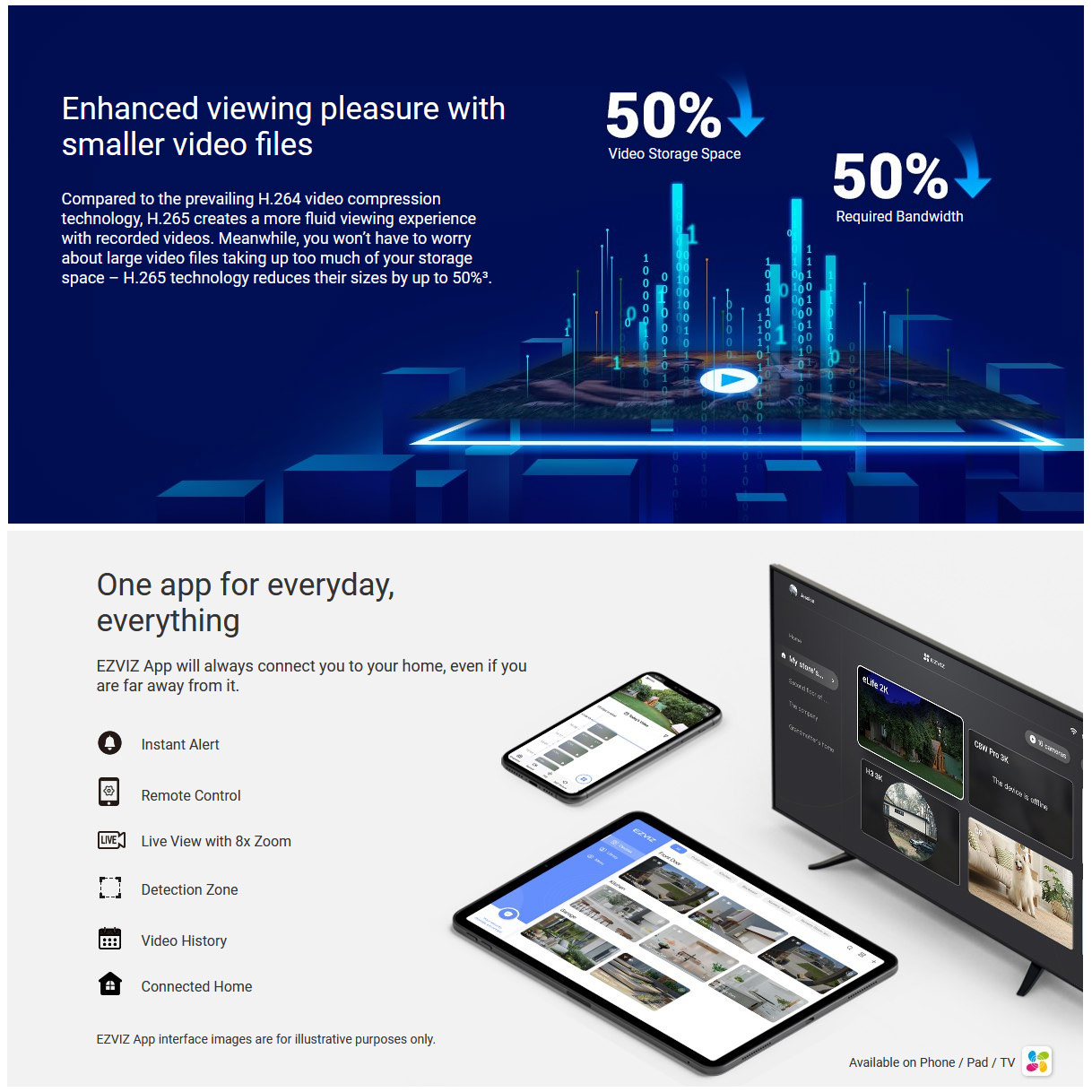 Διαθέτει υπέρυθρος (IR) φωτισμό με εμβέλεια ως 30m, συμπίεση H.265 για ταχύτερη μετάδοση και περισσότερες ημέρες διάρκεια καταγραφής, frame rate 25fps, digital WDR, 3D DNR, ενσωματωμένο μικρόφωνο για καταγραφή ήχου, χρησιμοποιεί αλγορίθμους τεχνητής νοημοσύνης "AI-Powered Human Shape Detection" για ανίχνευση ανθρωποειδούς κίνησης. Υποστηρίζει Alexa και Google Assistant