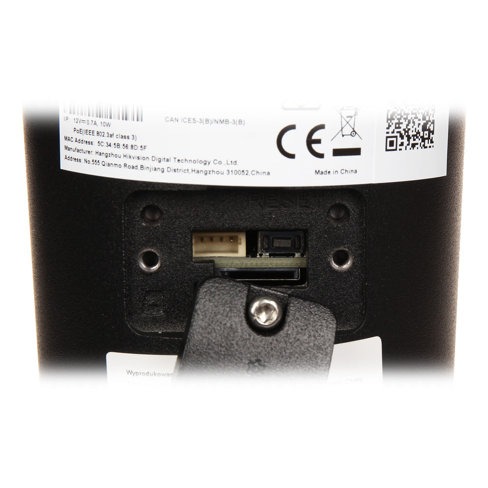 Διαθέτει υποδοχή για κάρτα μνήμη MicroSD ως 512GB για τοπική καταγραφή των Videos, η οποία βρίσκεται σε ειδική θέση στην κάτω πλευρά του σώματος της κάμερας, για εύκολη πρόσβαση κατά την τοποθέτηση της κάρτας μνήμης. Επιπλέον, σας παρέχει δυνατότητα τροφοδοσίας και με 12VDC στο Jack τροφοδοσίας της κάμερας, αλλά υποστηρίζει και τροφοδοσία Power Over Ethernet (PoE 802.3af) για απευθείας τροφοδοσία μέσα από το καλώδιο Ethernet, από συμβατές συσκευές (PoE NVR, PoE Switches ή PoE Injectors) που πληρούν το πρότυπο 802.3af. Δεν περιλαμβάνει τροφοδοτικό. Διαστάσεις: Ø74.4 mm × 176.3 mm