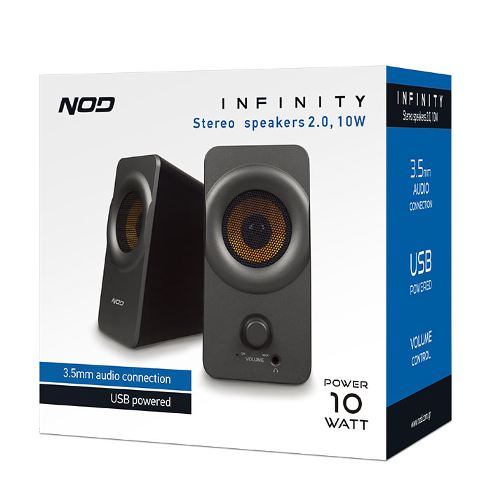 Με δυναμικό, διαχρονικό και κομψό σχεδιασμό, τα ηχεία NOD INFINITY θα σας δώσουν την καλύτερη δυνατή ποιότητα ήχου από κάθε υπολογιστή, laptop ή άλλη συσκευή αναπαραγωγής ήχου στην οποία τα χρησιμοποιείτε.